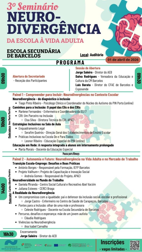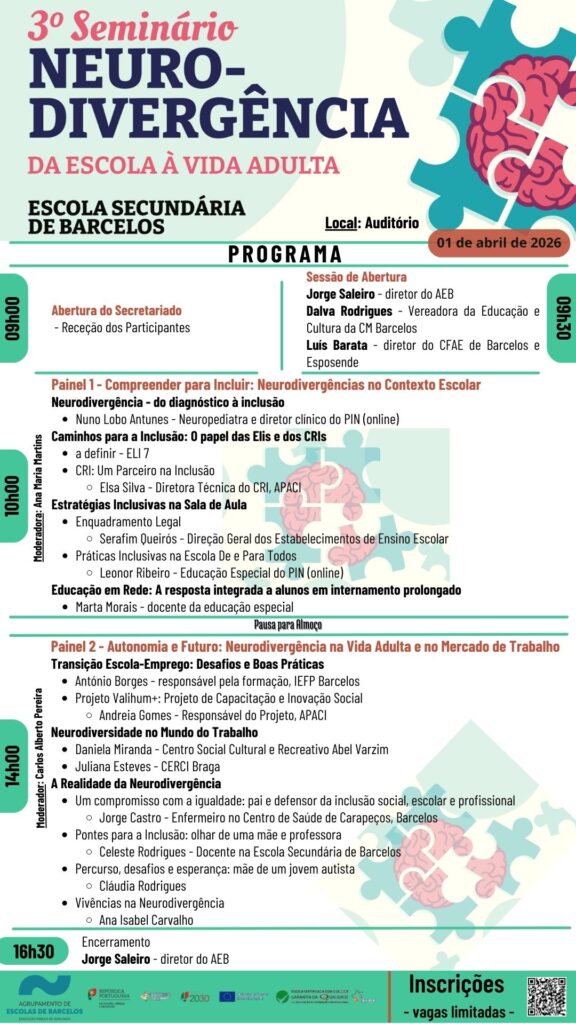 Este seminário promove a compreensão da neurodivergência para uma educação mais inclusiva, reforçando a articulação entre escola, família e comunidade, o enquadramento legal e estratégias pedagógicas que favorecem o sucesso dos alunos, destacando ainda o papel da escola na autonomia e inclusão social ao longo da vida