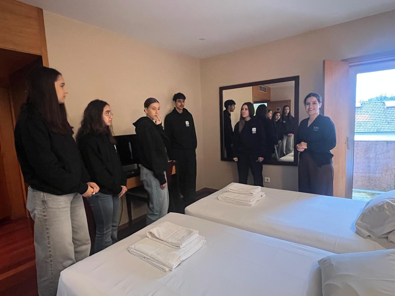 No dia 15 deste mês, os alunos do 11.º ano do Curso Profissional de Turismo participaram numa aula prática no Hotel Flag, localizado no centro da cidade de Barcelos, no âmbito da sua formação profissional. Esta atividade teve como principal objetivo proporcionar aos alunos um contacto direto com a realidade do setor hoteleiro. Ao longo da visita, os alunos ficaram a conhecer os diferentes departamentos do hotel, compreendendo a sua organização, funcionamento e a importância de cada área para o bom desempenho da unidade hoteleira. Para além da vertente observacional, os alunos tiveram ainda a oportunidade de realizar tarefas práticas, acompanhados pelos profissionais do hotel. No departamento de andares, colaboraram na arrumação de um quarto, bem como na organização da loiça do pequeno-almoço. Na receção, puderam perceber o funcionamento do sistema informático, assim como as principais funções e responsabilidades desempenhadas neste setor. Esta aula prática revelou-se uma experiência extremamente enriquecedora, permitindo aos alunos aplicar os conhecimentos adquiridos em contexto de sala de aula, desenvolver competências técnicas e reforçar a ligação entre a formação escolar e o mundo do trabalho. A escola agradece ao Hotel Flag Barcelos pela disponibilidade, acolhimento e colaboração nesta atividade formativa.