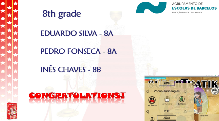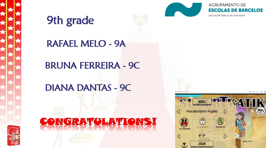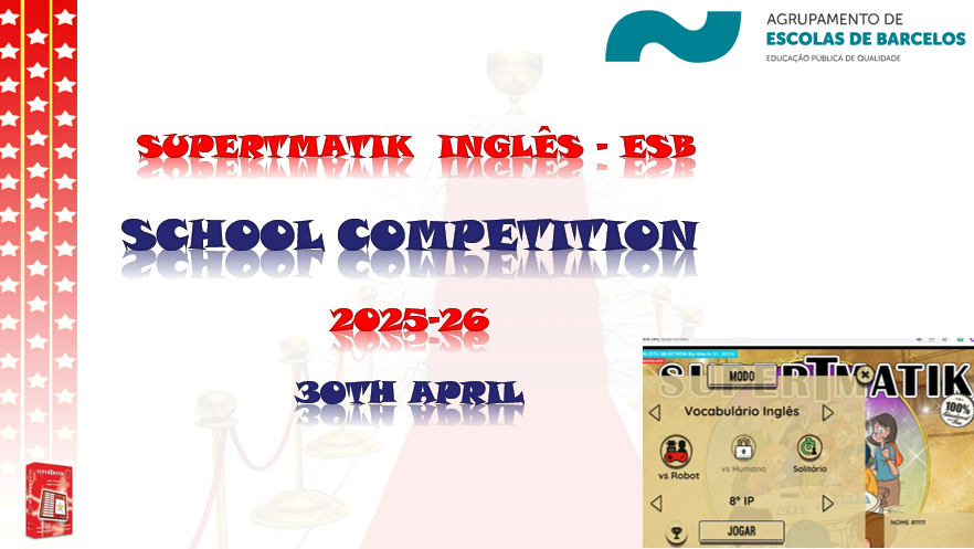Realiza-se, no próximo dia 30 de abril, a final nacional do concurso Supertmatik de inglês, no qual os alunos da ESB têm conquistado sempre lugares muito honrosos, tendo no ano passado conseguido um lugar no TOP 10. Mais precisamente, o aluno Rafael Melo, do 8º A, classificou-se em 7º lugar, sendo que este ano não poderia deixar de participar, este ano como aluno de 9º ano.